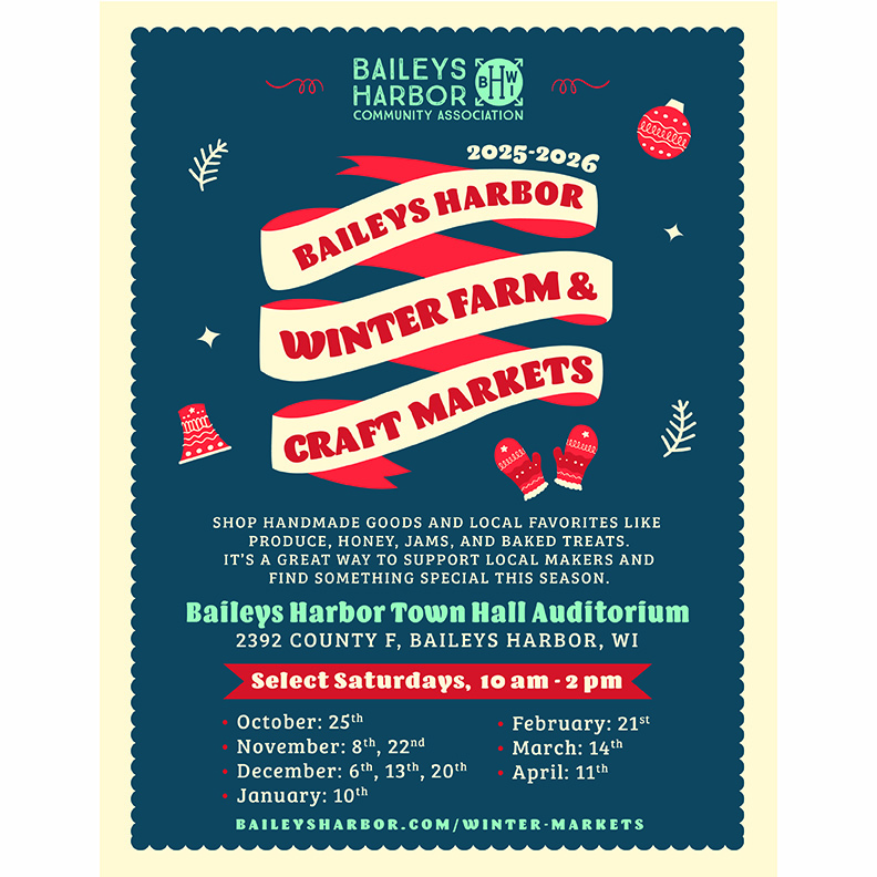 Baileys Harbor, Wis. (October 17, 2025) – The Baileys Harbor Community Association (BHCA) is excited to share the upcoming schedules for two exciting winter events: the Saturday Winter Craft Markets and Sunday Winter Yoga sessions. These programs offer residents and visitors an opportunity to […]