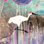 Gail McCoy captures the serene beauty of the crane in her stunningly paper collages. Working with National Geographic magazines, McCoy creates beautiful color washes and patterns by breaking down and manipulating the ink on the pages of the magazine. She painstakingly color matches pages to craft dynamic landscapes for her delicately cut cranes.