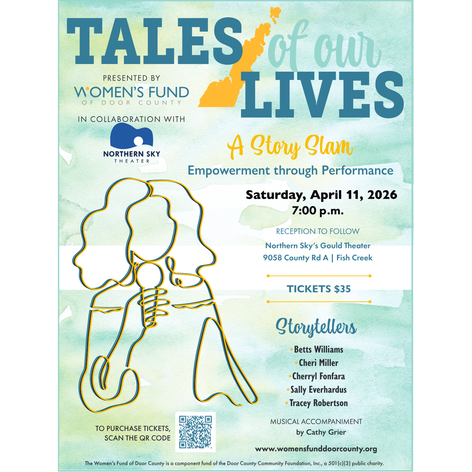 Join us for the 13th annual production of “The Tales of Our Lives – A Story Slam” presented by the Women’s Fund of Door County in collaboration with Northern Sky Theater. Five storytellers will take the stage to share their stories. Accompanied by the music of local blues artist Cathy Grier, each tale will revolve around a unique experience, relationship or life lesson that left a profound mark on the speaker.