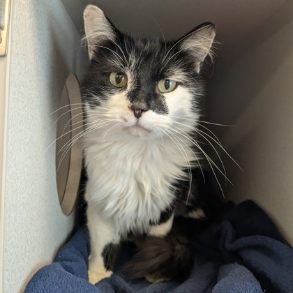 Reaper is 6 years old, weighs 9 pounds, and is available for adoption at the Wisconsin Humane Society Door County Campus. Reaper is a very pretty boy with long wispy black and white fur. He also loves to lounge around and take long cat naps. When he isn’t napping staff say he loves to cuddle and sit in their lap!