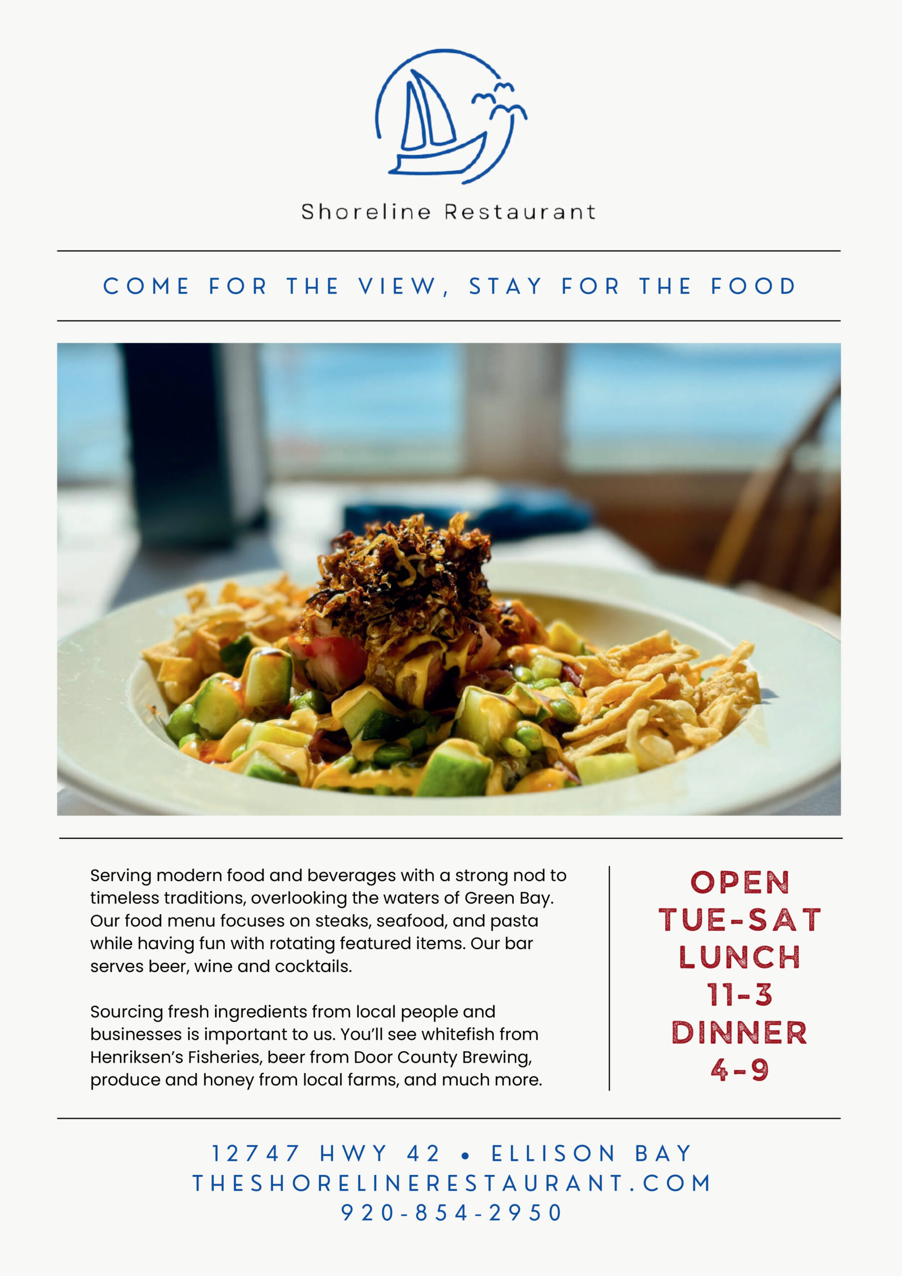 Shoreline Restaurant is now under new ownership, but with the same aesome view and an exciting new menu. Serving modern food and beverages with a strong nod to timeless traditions. New menu will focus on steaks, seafood, and pasta while having fun with trendy rotating featured items. Try something new like Chili Garlic Scallops, Rustic Cioppino, Brown Butter Chicken, or honor tradition with local whitefish options.