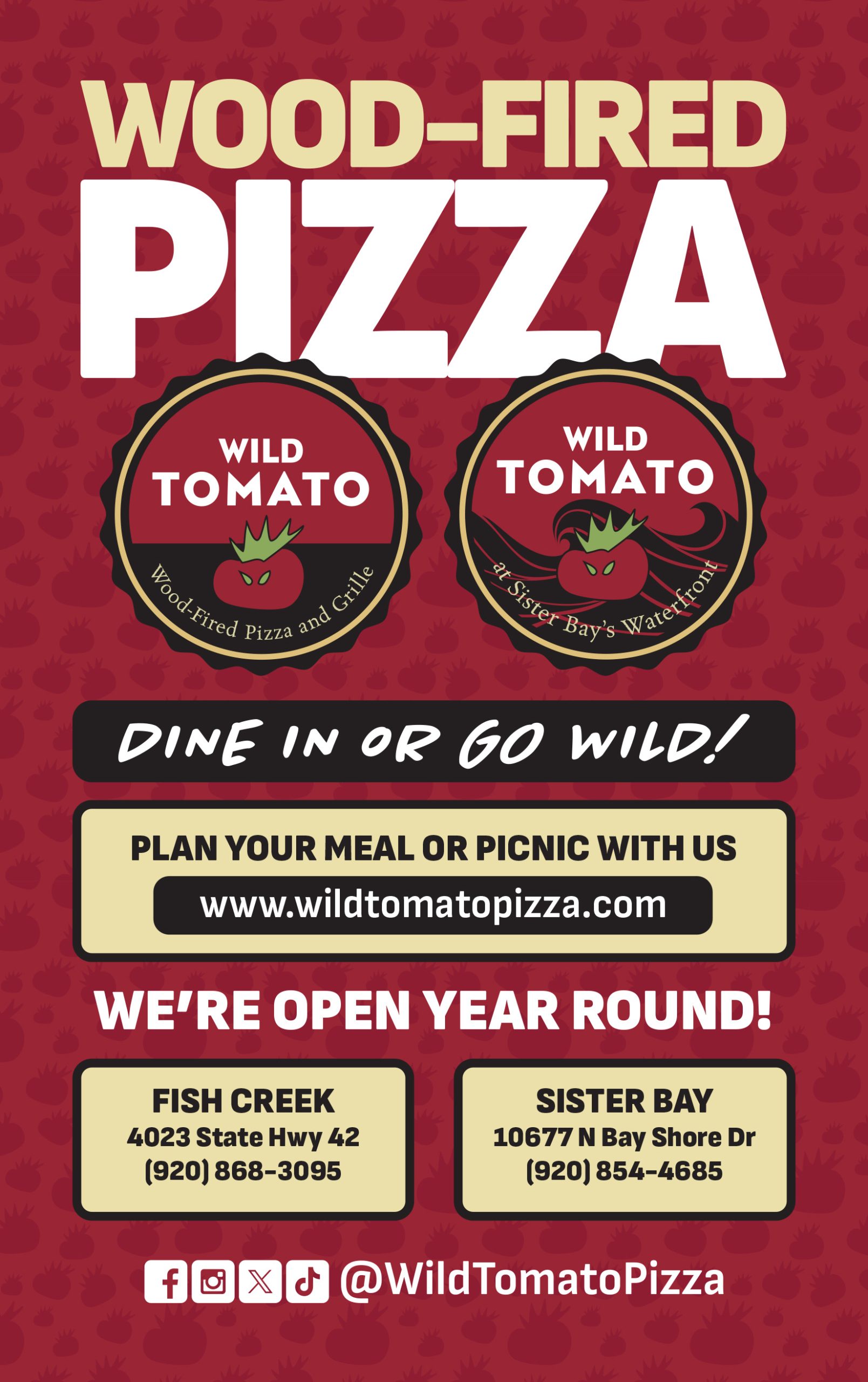 With Door County's only wood-fired oven, Wild Tomato is a year round restaurant serving pizza, sandwiches, and salads with a focus on sourcing local, seasonal, and organic ingredients whenever possible. Family-owned, Wild Tomato is a family friendly, casual restaurant with an extensive craft beer and wine list that has been serving DC locals and visitors for over a decade.